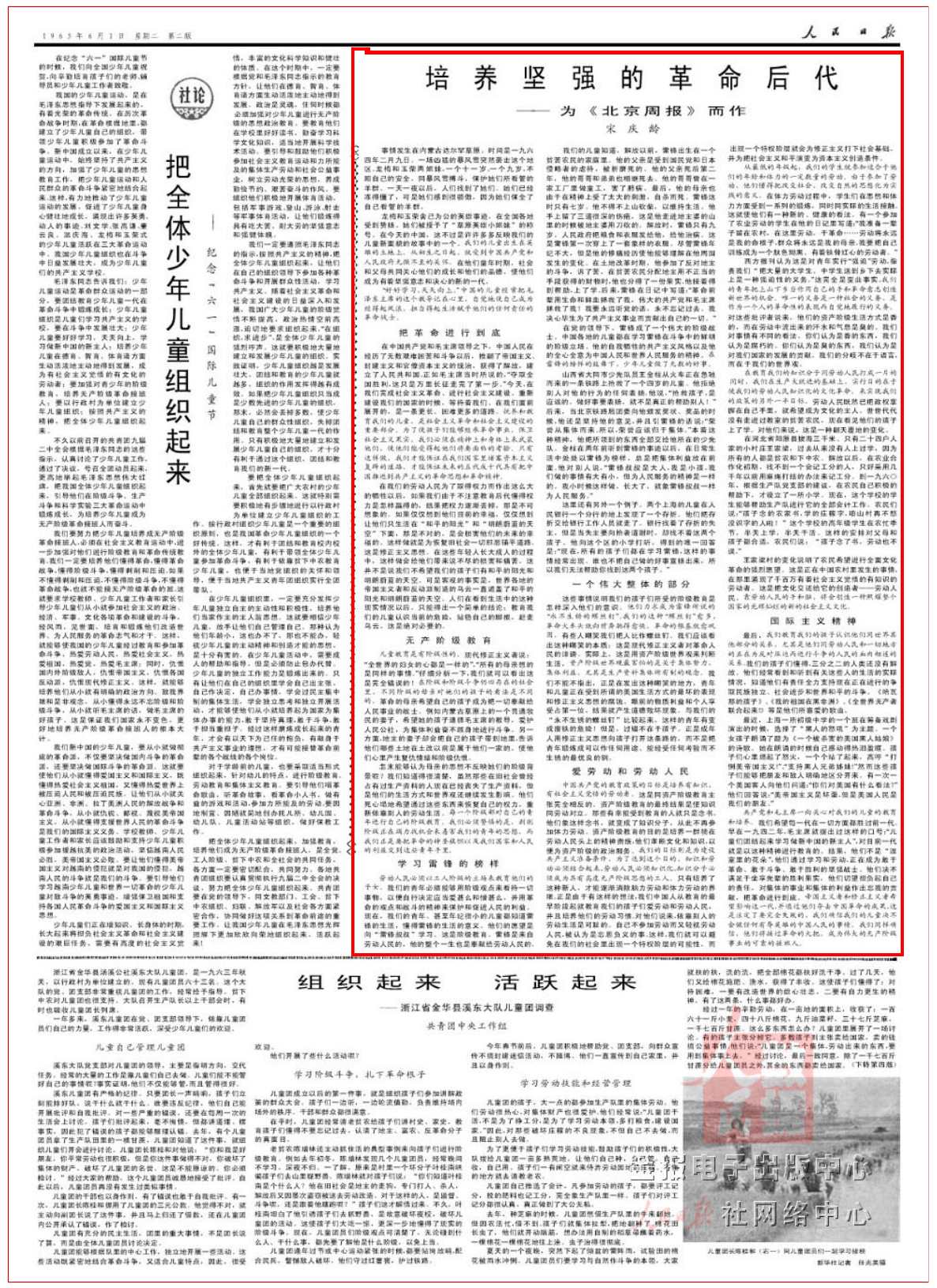 共产党和毛主席一向关心对我们的儿童的教育和培养。我们希望每一代在一切方面都胜过前一代。早在一九四二年,毛主席就提出过这样的口号:“儿童们团结起来学习做新中国的新主人”,对目前一代就是以这种精神进行教育的。结果,他们不是“温室里的花朵”,他们通过学习和劳动,正在成为敢于革命、敢于斗争、敢于胜利的坚强战士。他们决不满足于坐享先辈的胜利果实,他们切望担负起自己的责任,对集体的事业和集体的利益作出忘我的贡献,把革命进行到底。帝国主义者和修正主义者希望影响这一代,并通过他们夺去中国革命的成果,这是注定了要完全失败的,我们确信我们的儿童决不会做任何有辱英雄的中国人民的事情。我们同样确信,他们将接过革命的火把,成为伟大的无产阶级事业的可靠的接班人。