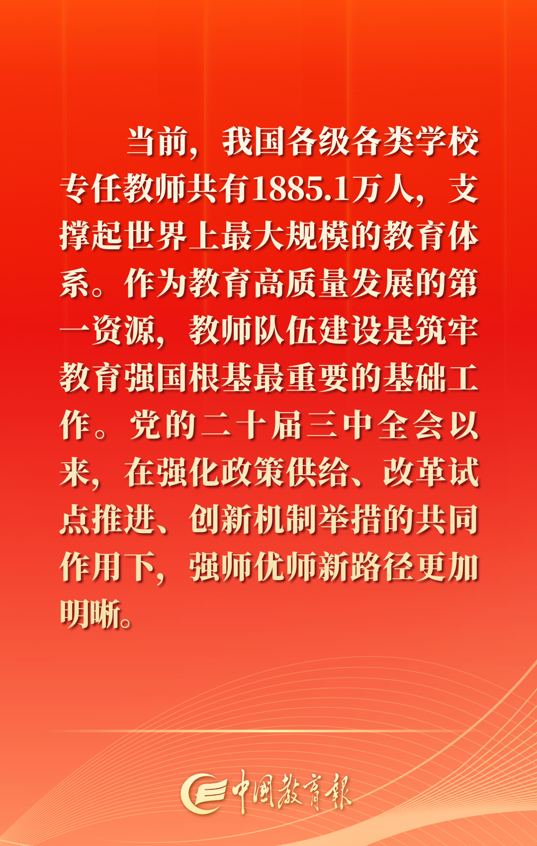 当前,我国各级各类学校专任教师共有1885.1万人,支撑起世界上最大规模的教育体系。作为教育高质量发展的第一资源,教师队伍建设是筑牢教育强国根基最重要的基础工作。过去一年,在强化政策供给、改革试点推进、创新机制举措的共同作用下,强师优师新路径更加明晰。