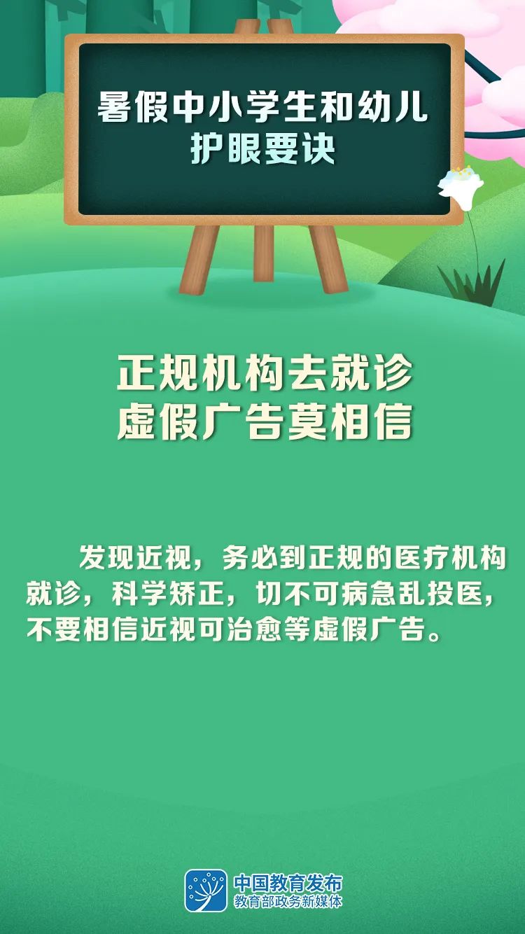 2021年暑假来临之际,教育部指导全国综合防控儿童青少年近视专家宣讲团,提出2021年暑假中小学生和幼儿护眼要诀,倡导广大中小学生和幼儿假期科学合理安排好生活、学习,科学健康护眼。跟教育小微一起看要诀大图——